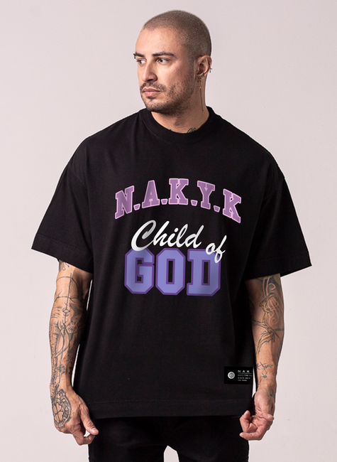 A Camiseta Child é confeccionada em malha de algodão e sua modelagem é no estilo oversized. Possui gola com 2,5 cm de altura feita de ribana. A peça possui estampa na frente em DTF. E contém uma etiqueta conceito próximo à barra e nuca.