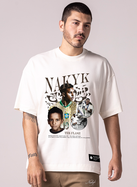 A Camiseta é uma homenagem à essência e instinto do jogo de Rodrygo, o “The Flash”, a peça traduz velocidade, precisão e presença — características de quem ataca com instinto felino. Sua estampa frontal traz uma composição que mistura força e nostalgia, com imagens que simbolizam a trajetória do craque desde a infância até o auge. Confeccionada em malha 100% algodão, possui modelagem oversized, gola em ribana de 2,5 cm e acabamento de alta durabilidade.