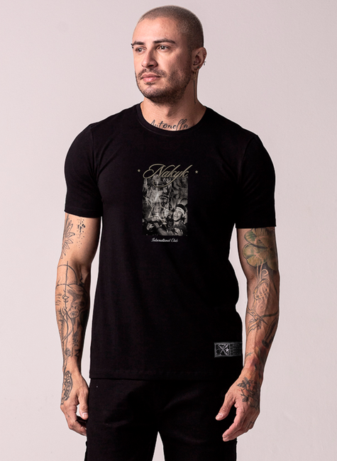 A peça ainda conta com etiquetas conceito aplicadas próximas à barra e nuca, reforçando a identidade exclusiva da NAKYK.