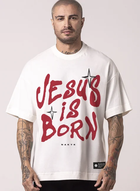 A Camiseta Jesus é uma peça da coleção cristã da Nakyk com uma estética mais urbana, moderna e expressiva. Com a frase “Jesus Is Born” em tipografia marcante e pincelada, ela une fé e streetwear em uma peça que se destaca pela presença e autenticidade.